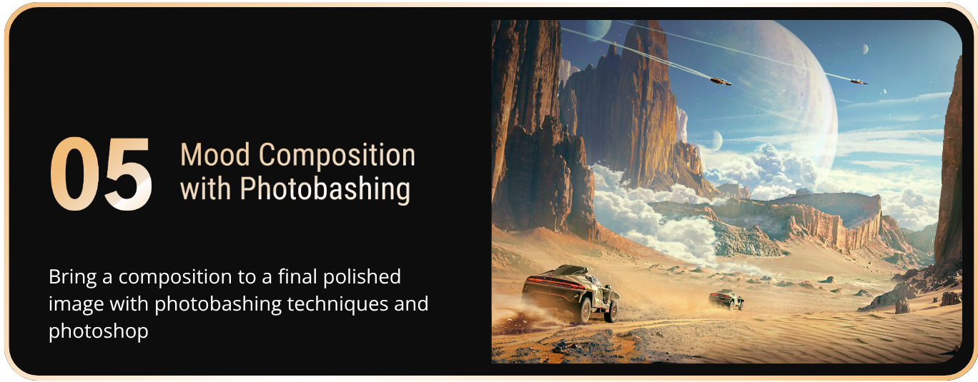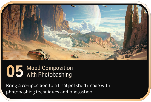 You can practice along with me, ask questions, and connect with other students in the community. The course covers everything from composition and lighting fundamentals to photobashing and final environment design workflows, and you can revisit any lesson as often as you like, wherever and whenever it suits you.